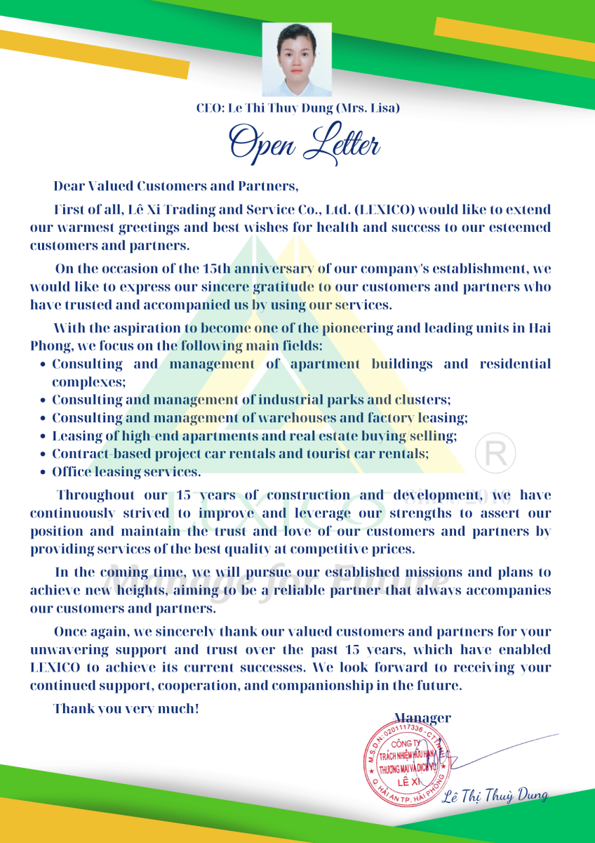 With 15 years of experience in the management, operation and exploitation of buildings in Hai Phong. Lexico has managed and operated condominiums and apartment buildings as Operation Management Unit, Management Board, Investor, Apartment Owner. Lexico has accumulated a series of Building Management Processes and Standards according to Southeast Asia standards and is suitable for the working environment in Vietnam, contributing to improving the work of "Green Management - Clean Services" for with Buildings.